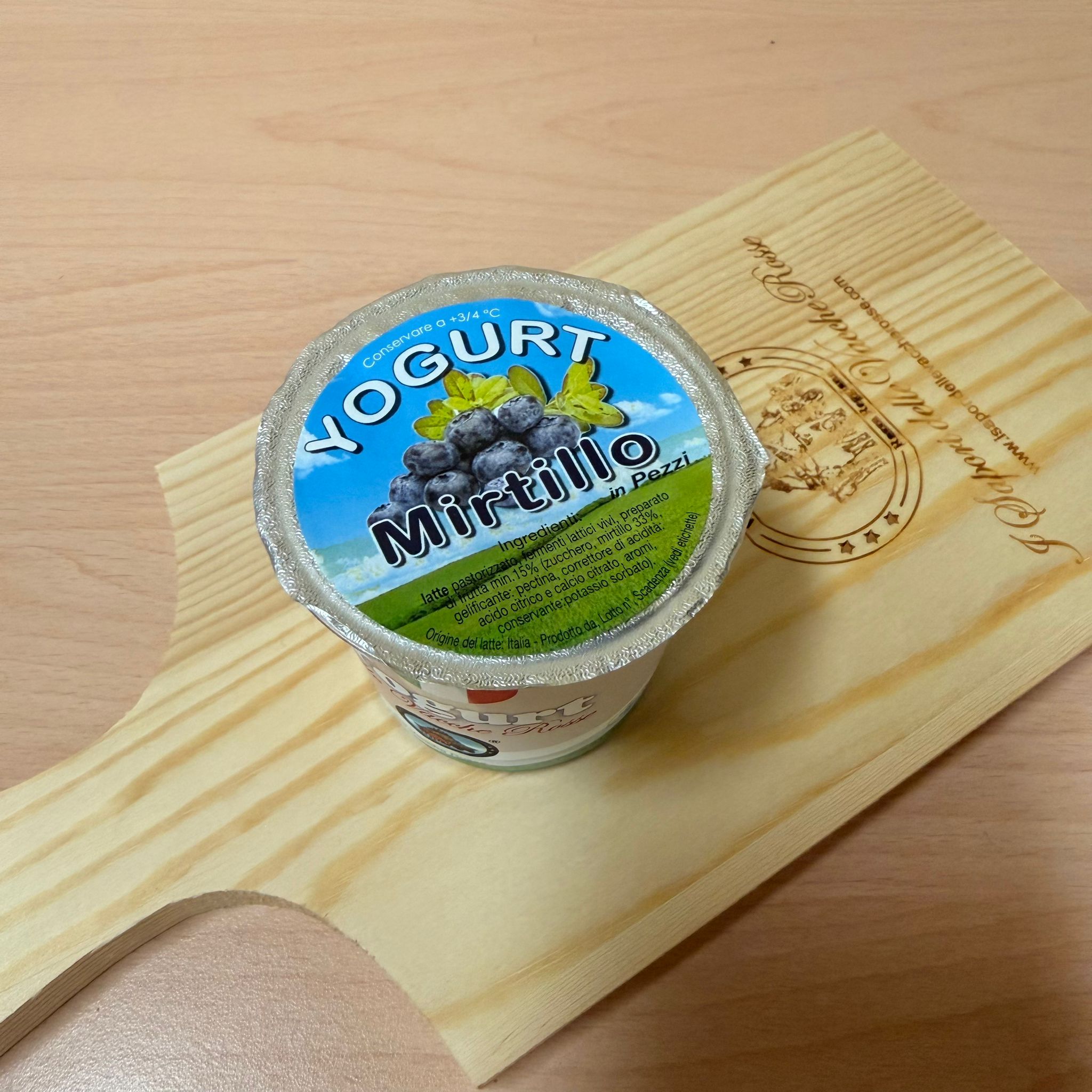 Ingredienti: LATTE intero delle Vacche Rosse, fermenti lattici vivi (lactobacillus, bulgaricus, strptococcus, thermophilus), preparato di frutta min. 15% (zucchero, mirtillo 33%, gelificante: pectina, correttore di acidità:acido citrico e calcio citrato, aromi.